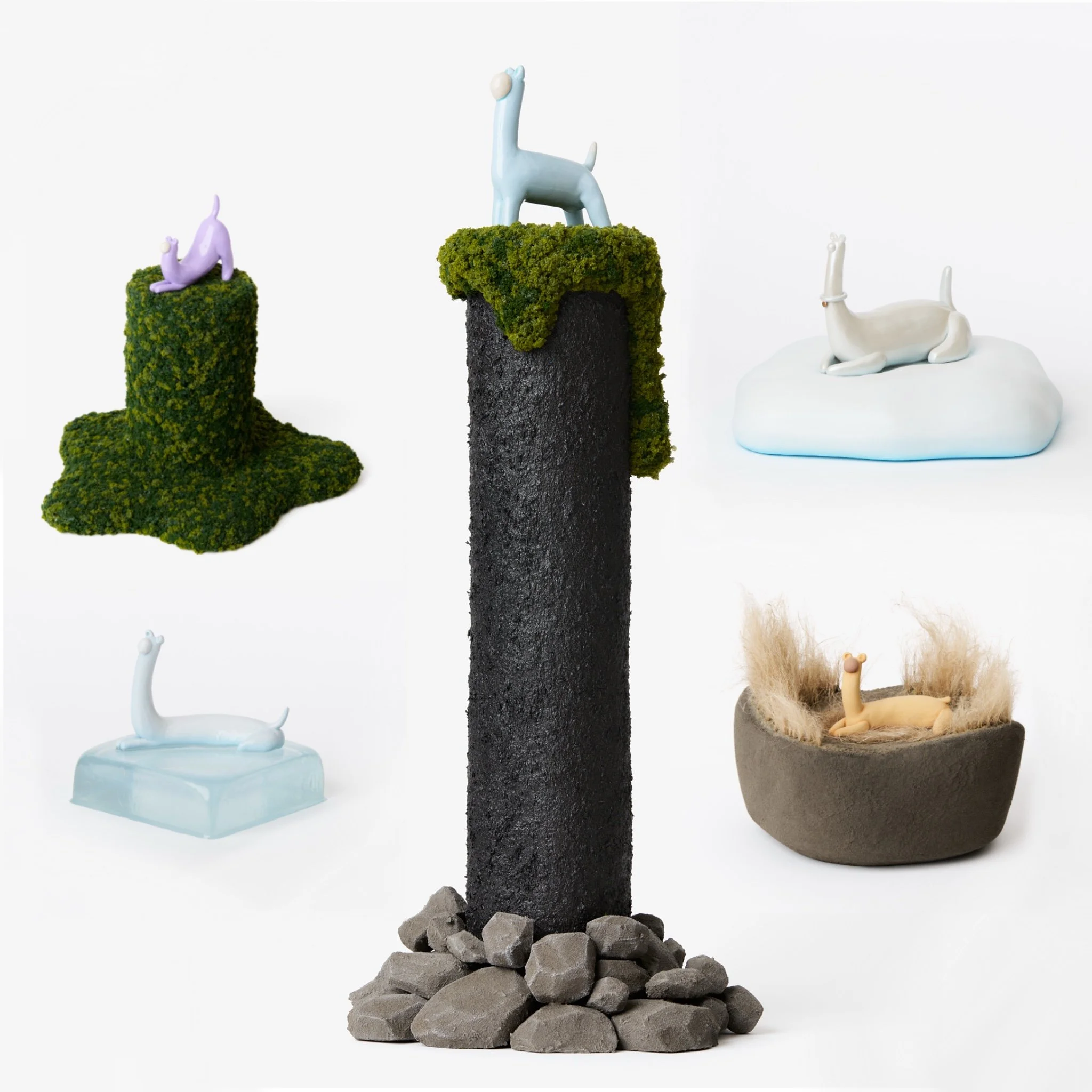 The Space Dog Collection5 piece series of sculptures created from ceramic, foams, faux mosses, and epoxy resins2026. Meet the Space Dogs Protector Melt Ice Cold Drought Nimbus In The Sky
